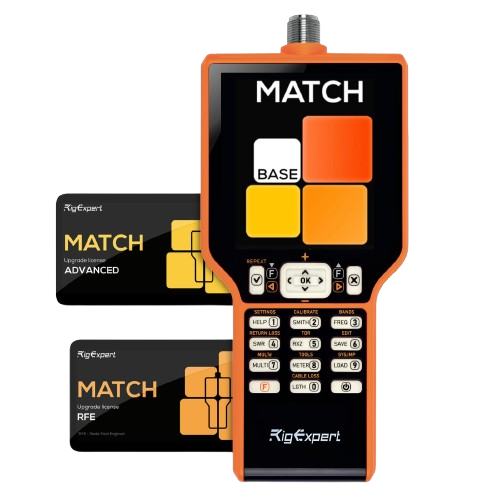 The RigExpert MATCH Analyzer is a versatile antenna and cable analyzer for radio amateurs. In the frequency range from 0.1 to 70 MHz, it accurately measures SWR, impedance, reactance, and more—ideal for antenna matching, cable testing, and system diagnostics. The 4-inch color display provides a clear view, and stored measurements can be easily compared. The analyzer is ready for immediate use and can be customized. License upgrades expand the range of functions: The Advanced License offers BLE connectivity and up to 230 MHz, while the RFE License extends to 500 MHz and enables TDR analysis.